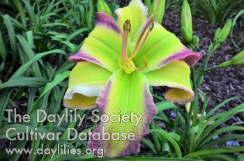 | Description : Pétales jaunes avec une légère teinte pêche le long de la nervure médiane plus claire. Les sépales sont un peu plus teintés pêche. La gorge vert vif et les pétales ont une bordure frangée jaune. | |