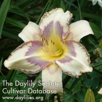 | Description : Crème avec un énorme œil violet et un bord tressé violet argenté au-dessus d'une gorge verte s'étendant jusqu'au jaune | |